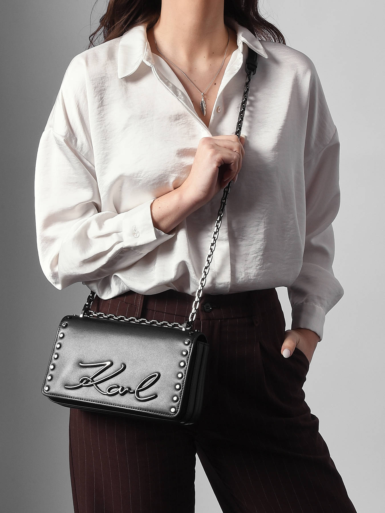 Le sac bandoulière K SIGNATURE Karl Lagerfeld, fabriqué en cuir de vachette de qualité, allie élégance intemporelle et fonctionnalité. Son extérieur lisse et raffiné se ferme par un rabat sécurisé par un aimant, garantissant la protection de vos effets personnels tout en offrant un accès facile au compartiment principal. Conçu pour un porté en bandoulière, ce sac assure un confort optimal et une liberté de mouvement tout en apportant une touche chic et moderne à vos tenues. L’intérieur se compose d’un compartiment spacieux complété par une poche simple, idéale pour organiser vos indispensables avec simplicité. Compact et pratique, ce modèle reflète parfaitement l’esthétique sophistiquée et contemporaine de Karl Lagerfeld, faisant de lui un accessoire polyvalent et élégant pour accompagner toutes vos occasions, du bureau aux sorties.